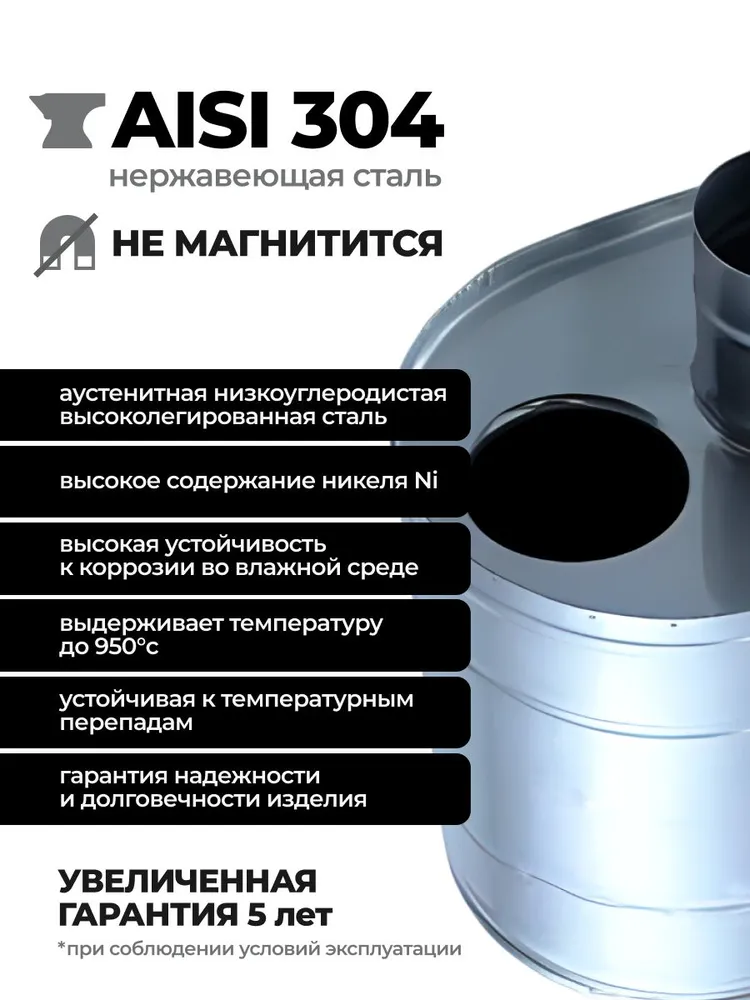 Бак изготовлен из аустенитной низкоуглеродистой нержавеющей стали AISI 304 толщиной 0,8 мм. Благодаря высокому содержанию Никеля в составе марки AISI 304, сталь отличается высокой устойчивостью к коррозионному воздействию во влажной среде. Сталь устойчива к температурным перепадам и выдерживает температуру до 950°С. Гарантируя надежность и более долгий срок службы изделия.