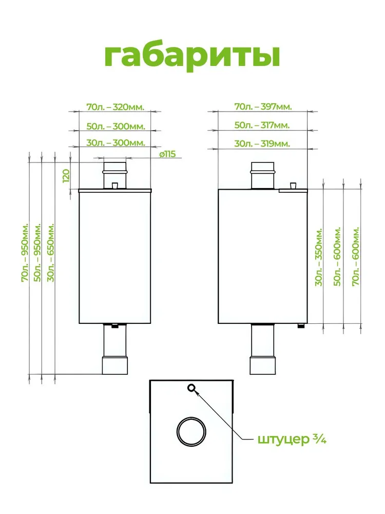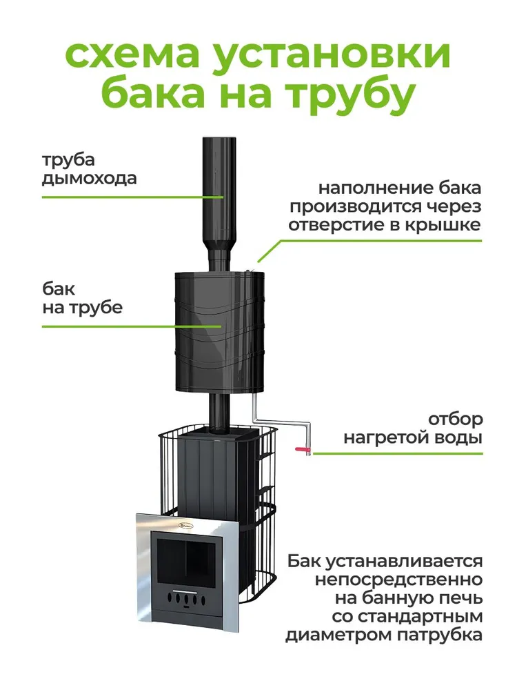 Бак оснащен одним штуцером 3/4. Легко устанавливается и подходит для различных типов банных печей.