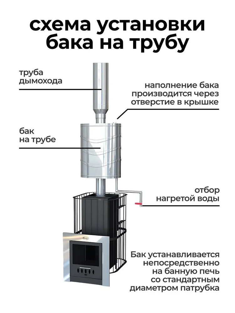 Бак оснащен одним штуцером 3/4. Легко устанавливается и подходит для различных типов банных печей.