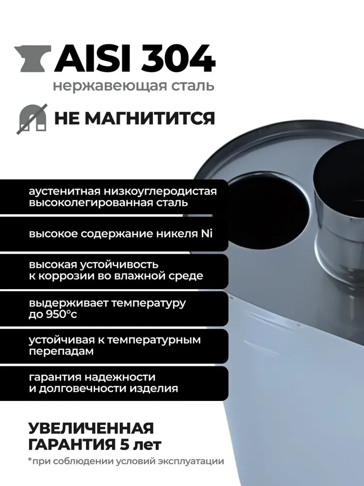 Бак изготовлен из аустенитной низкоуглеродистой нержавеющей стали AISI 304 толщиной 0,8 мм. Благодаря высокому содержанию Никеля в составе марки AISI 304, сталь отличается высокой устойчивостью к коррозионному воздействию во влажной среде. Сталь устойчива к температурным перепадам и выдерживает температуру до 950°С. Гарантируя надежность и более долгий срок службы изделия.