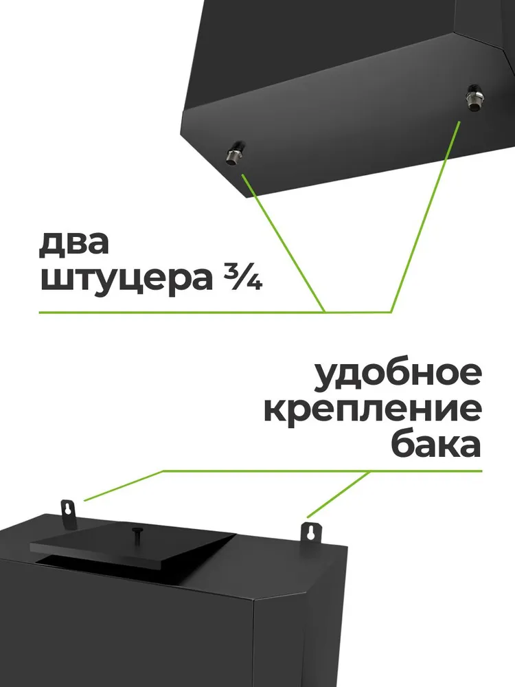 Бак оснащен двумя штуцерами 3/4. Легко устанавливается и подходит для различных типов банных печей.