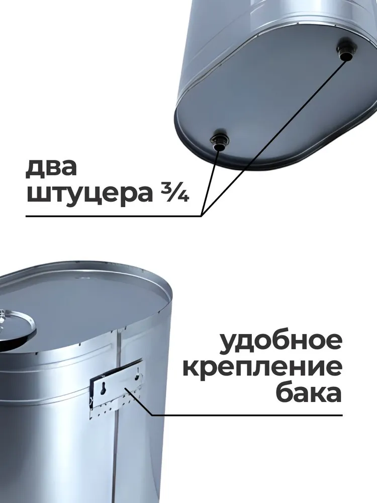 Бак оснащен двумя штуцерами 3/4. Легко устанавливается и подходит для различных типов банных печей.