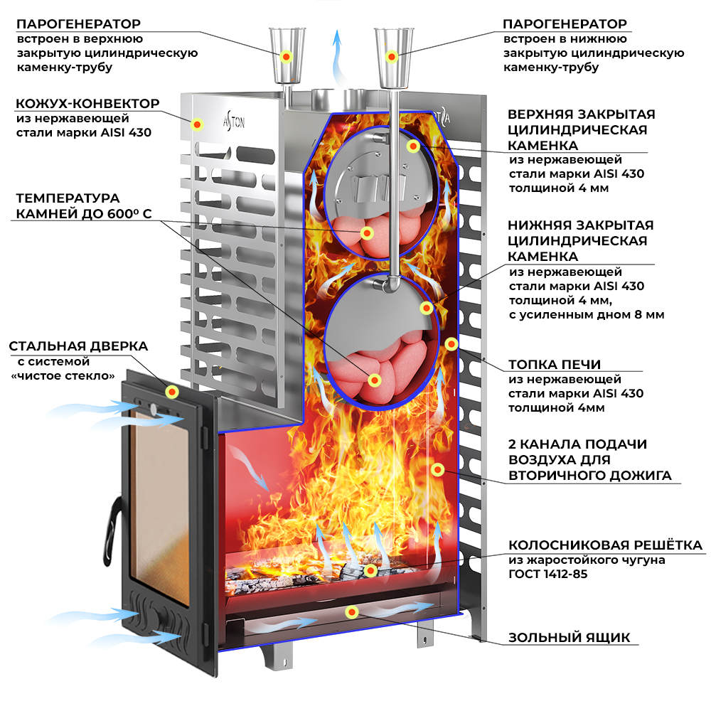 Материал закрытой каменки: нержавеющая сталь AISI 430