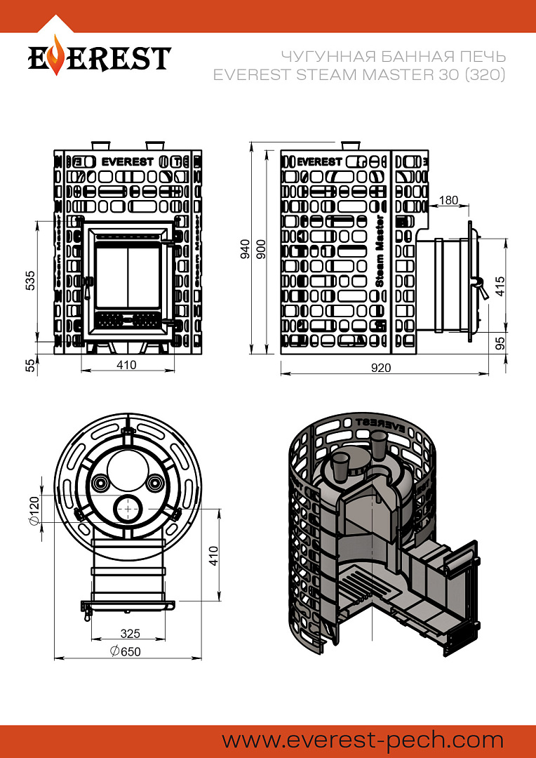 Банная печь Эверест "Steam Master" 30 (320) ЧУГУН предназначена для нагрева помещений и получения пара в парных объёмом до 30 кубических метров.